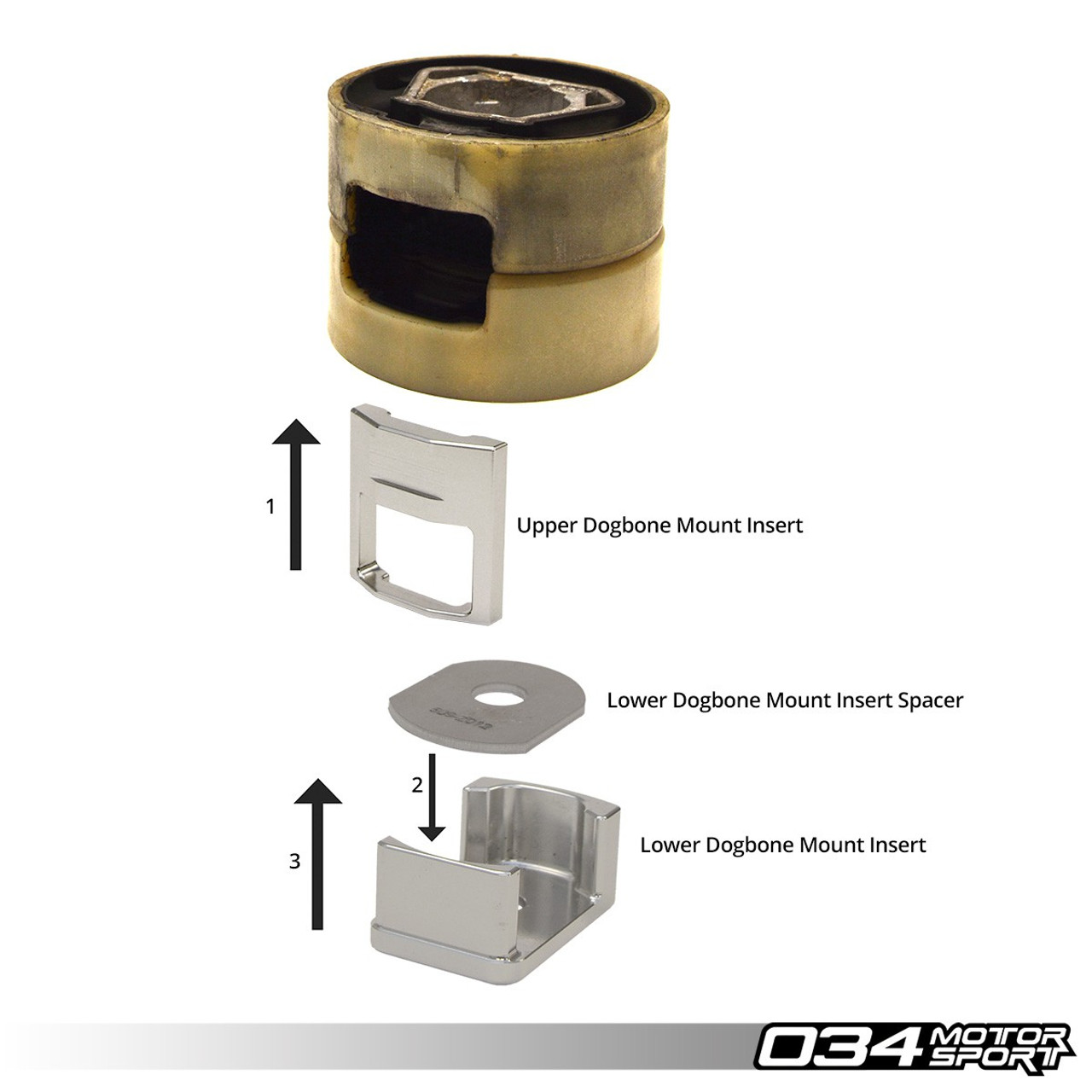 The 034Motorsport Upper Dogbone Mount Insert (patent pending) recommended for any MkV/MkVI Volkswagen Golf/GTI/R/Jetta/GLI and 8P Audi A3 & 8J Audi TT/TTS/TTRS using any dogbone mount and dogbone mount insert, and is strongly recommended when using the OEM dogbone mount and a lower insert. Aggressive driving that causes violent drivetrain movement, such as burn-outs that induce wheel-hop, will cause the upper and lower dogbone mounts to exert a bending moment on the dogbone mount arm, causing it to bend, and in some cases fail. When this failure occurs, the bottom of the engine is unconstrained and the engine will cause damage to other components in the engine bay. The 034Motorsport Upper Dogbone Mount Insert eliminates these bending forces, allowing the dogbone mount to perform as designed during these violent events.