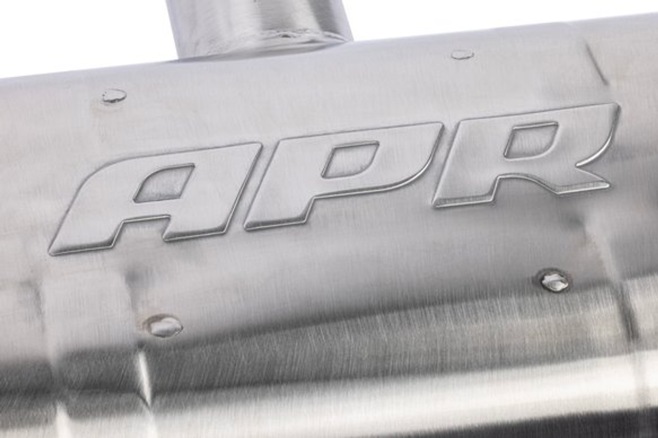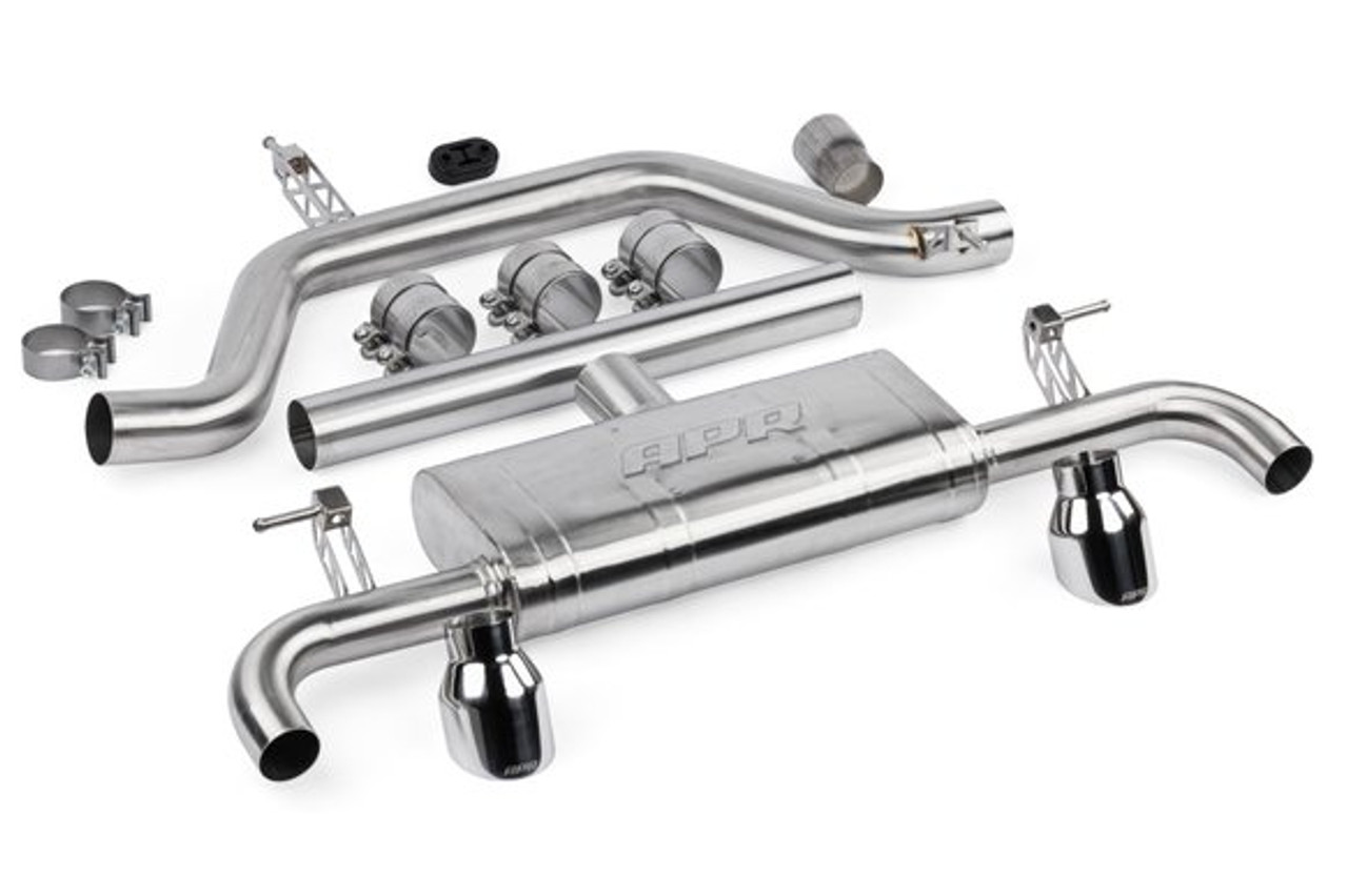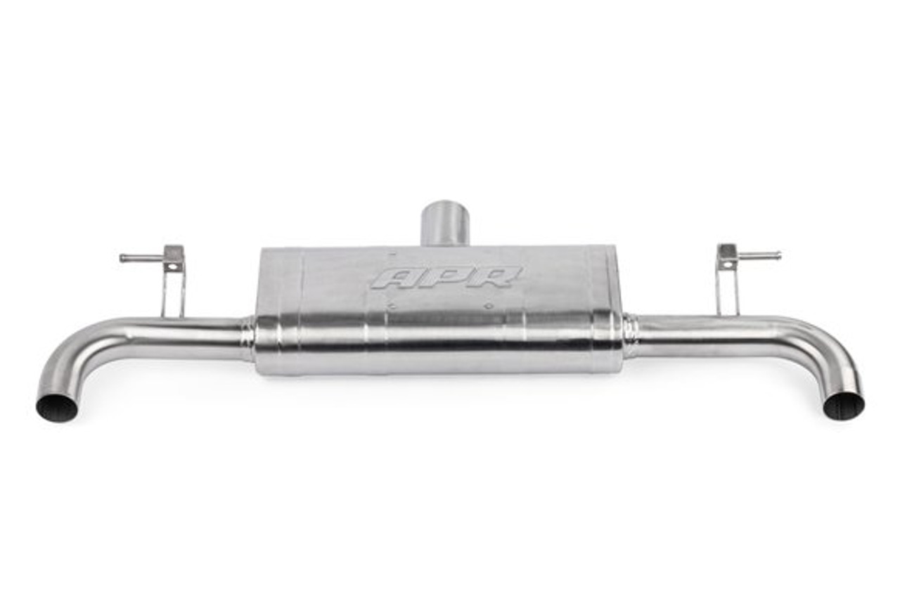 The APR Catback Exhaust System personalizes your vehicle’s looks, sound and performance. Beautifully hand-crafted T304-stainless-steel components adorn the system with stunning TIG-welding throughout. Our straight-through brushed-finished mufflers smooth the exhaust note to a deep growl, without adding restrictions or rasp. Strong high-quality bracketry and OEM-style clamps hold the system steadily in place, making the install or removal a snap, and fitment simple, yet precise. 3″ (76mm) mandrel-bent exhaust paths provide an ultra-smooth path, steadily feeding exhaust gasses out of the dual 2.5″ (63.5mm) exit pipes, while looking tidy from under the rear bumper. Finally, removable 4″ (102mm) polished slash-cut exhaust tips finish the system, adding a classy motorsport-inspired touch to the rear of the vehicle.