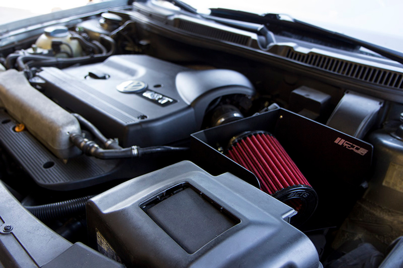 At CTS Turbo we are proud to announce our new air intake system for the MK4 VW 1.8T. The OEM air scoop works in conjunction with our sealed airbox to seamlessly force cold air into our air intake system. Air then flows through our high flow cone air filter, which utilizes an inverted cone design for maximum engine breathing. Our single piece CNC bent aluminum powder coated heat shield deflects heat and allows for smooth entry of cold air into the engine providing peak power gains ranging from 6-9HP. All of the components included in the CTS air intake system work flawlessly together to provide increased horsepower and torque throughout the entire power band and an aggressive race inspired sound.