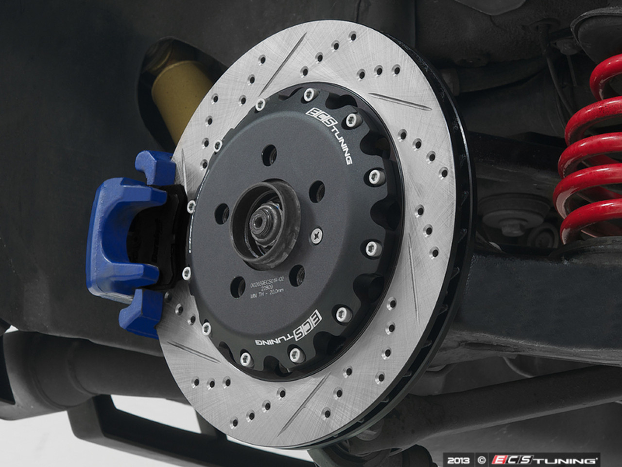 This bolt-on upgrade replaces your.256mmx22mm.rotors with massive.306mmx22mm.two-piece drilled and grooved ECS discs.