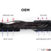 The OEM inlet duct was tailored to the majority of everyday drivers who prefer a muffled, relaxed driving experience. This came at the cost for air induction capacity and design. Inlet air is restricted to available airflow from two tiny passages on the opposite of the airbox at the front and rear of the inlet duct. At higher speeds we found that the rear-facing inlet draws in hot, engine-bay air into the airbox, increasing airbox inlet temps. The OEM inlet duct has further issues for performance-minded owners, such as a blocked off inlet passage directly in front of the airbox along with abrupt edges leading into the air inlet channel.