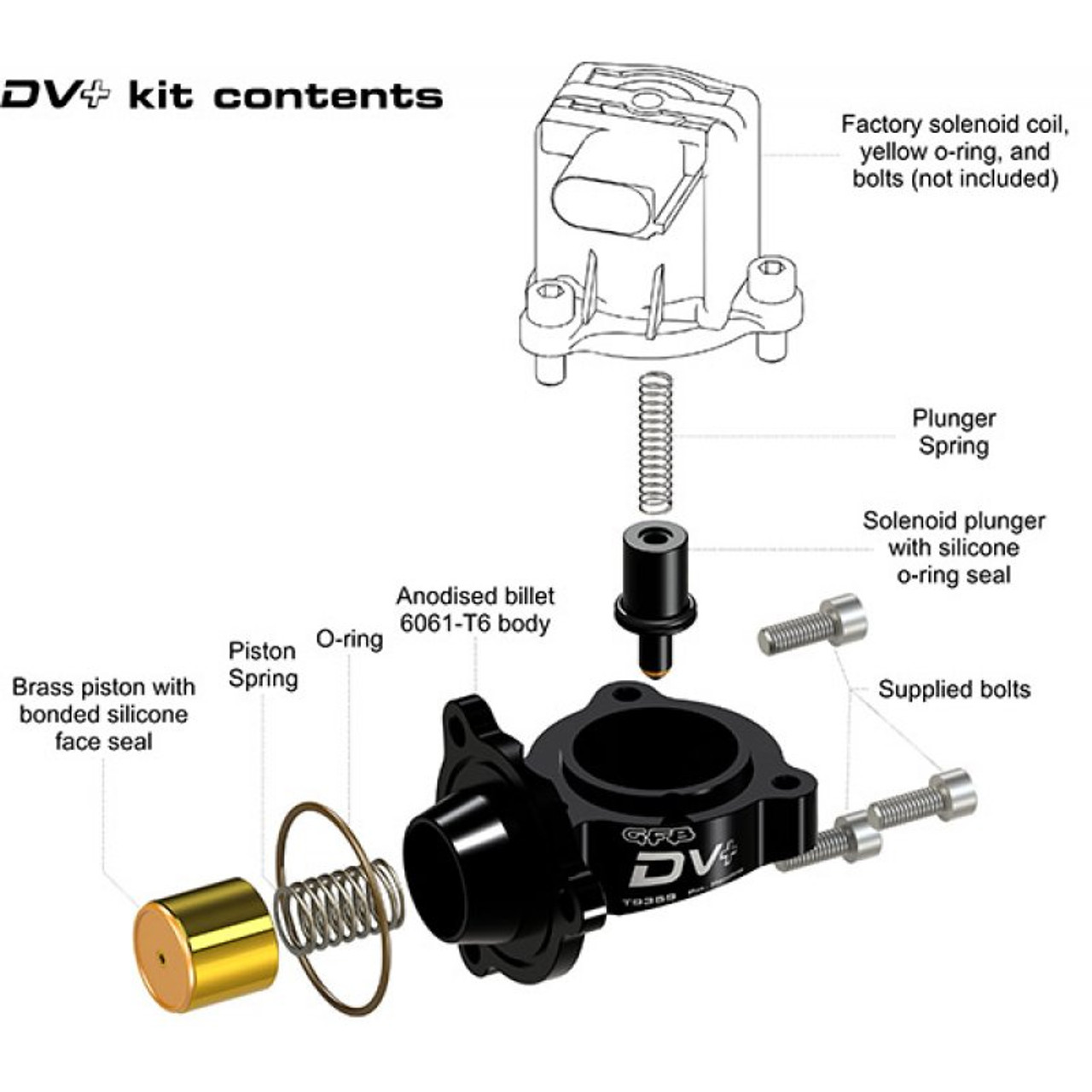 The solenoid coil itself from the factory-fitted valve is great (the ECU opens it faster than any pneumatic valve so why replace it?), but the weak point however is the valve mechanism itself. So GFB’s DV+ solves this problem by replacing just the valve parts with an anodised billet aluminium housing fitted with a brass piston machined to exacting tolerances.