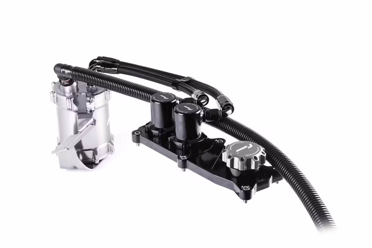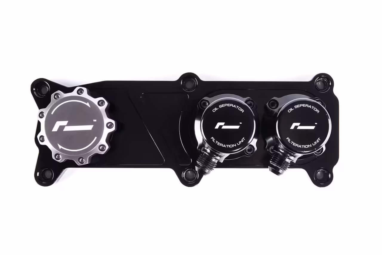 RacingLine’s V6T Catch Can System replaces the factory PCV with a gloss black billet PCV replacement block. This features two internally-baffled separator turrets and also deletes the failure-prone factory PCV check-valve.