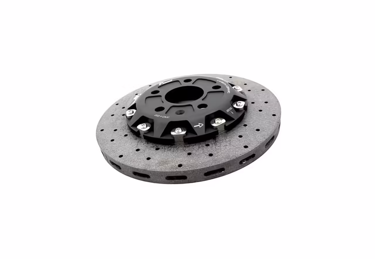 The 310 x 22mm rotor construction interweaves discontinuous carbon fibre to form a 3D multi-directional matrix. Which adds up to great weight savings, performance and durability versus traditional steel brakes.