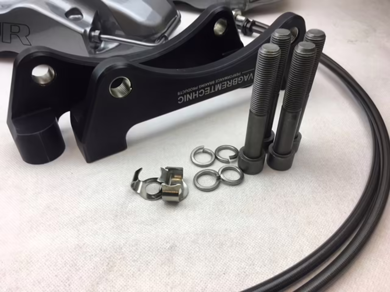 The caliper carriers are made from high strength zinc plated steel. The supplied front brake lines have been made to our specifications by HEL Performance, which include stainless steel fittings and are finished in their carbon black sheathing. The 2 piece brake discs are assembled with outer rotors made by AP Racing which are of the highest quality steel and come in either a grooved or drilled. Matched with our lightweight aluminium bells finished anodised in black, this brake disc setup is a floating 2 piece assembly and the float is in the disc bell rather than the disc. Lastly the fitting kit includes bolts that are high tensile M12x1.25 coupled with quality spring washers.