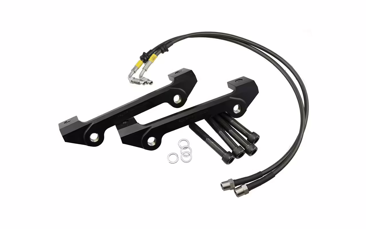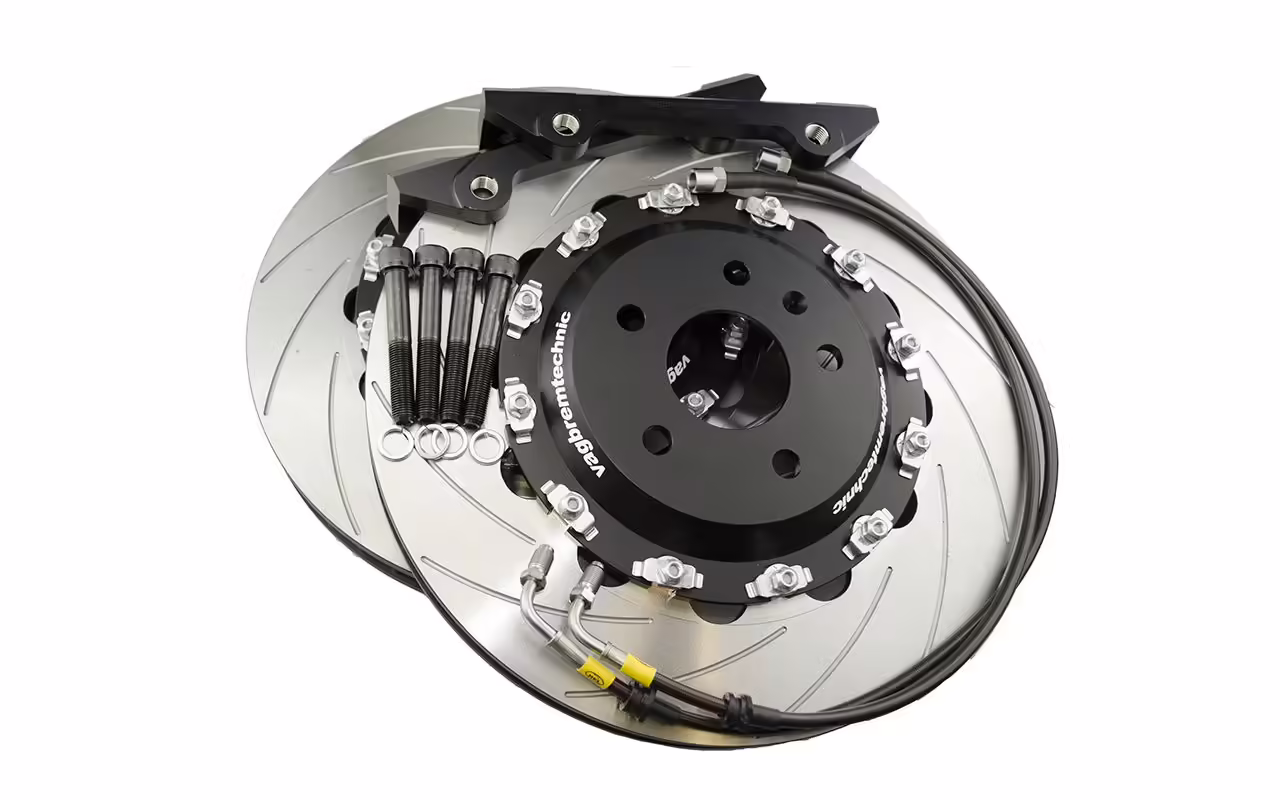 The caliper carriers are made from high strength zinc plated steel. The supplied front brake lines have been made to VBT’s specifications by HEL Performance, which include stainless steel fittings and are finished in their carbon black sheathing. The 2 piece brake discs are assembled with outer rotors made by AP Racing which are of the highest quality steel and come in either a grooved or drilled. Matched with VBT’s lightweight aluminium bells finished anodised in black, this brake disc setup is a floating 2 piece assembly and the float is in the disc bell rather than the disc. Lastly the fitting kit includes bolts that are high tensile M12x1.25 coupled with quality spring washers.